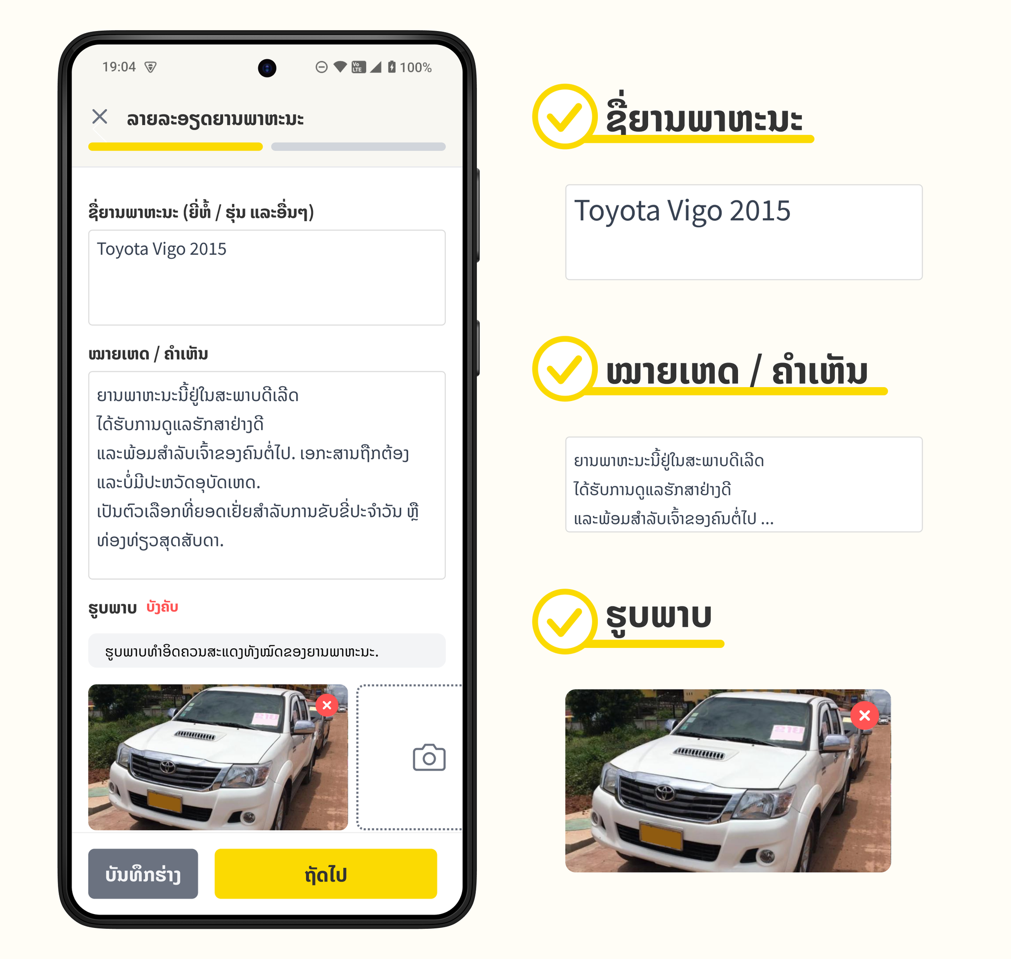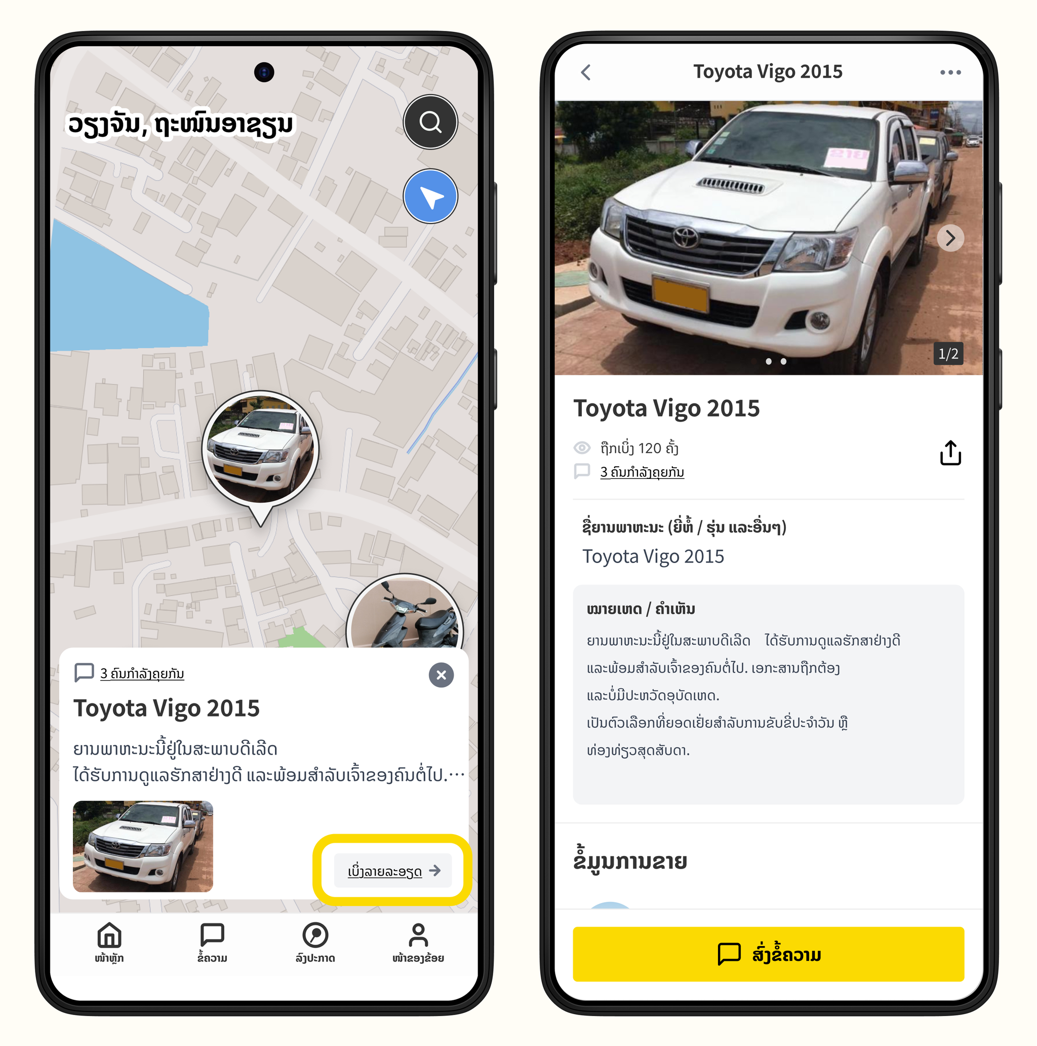 ຜູ້ຊື້ສາມາດຊອກຫາລົດໃກ້ໆ, ເບິ່ງລາຍລະອຽດ, ແລະຕິດຕໍ່ຜູ້ຂາຍໂດຍກົງຜ່ານການສົນທະນາ.
